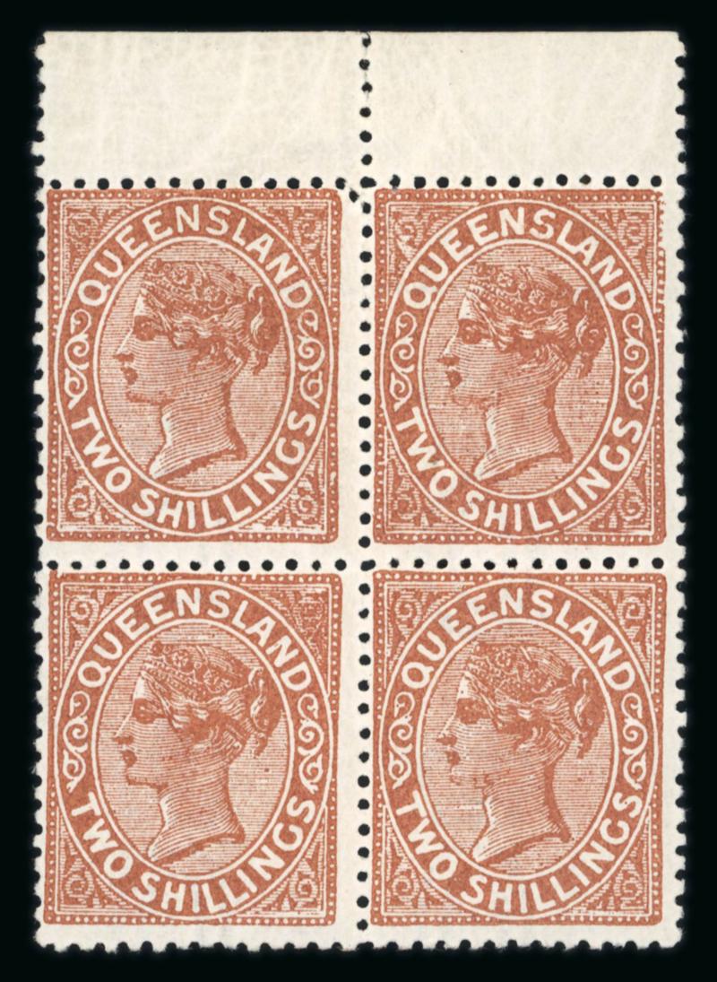1887-88 2s pale brown, type 12, watermark upright top marginal block of four, the top right stamp showing 'L' and 'A' of 'Queensland' joined at base, hinged in margin, stamps never hinged, fresh condition with some slight gum creasing. (Image)