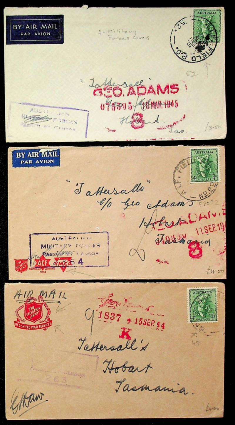 Australia WWII FPO Military Forces Passed Censor signed 3 airmail covers to Hobart Tasmania (Image)