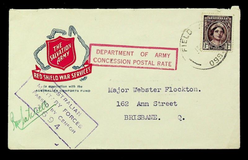 Australia 1d on Salvation Army concession postal rate Passed by Censor-2694 signed cover to Brisbane Queensland (Image)