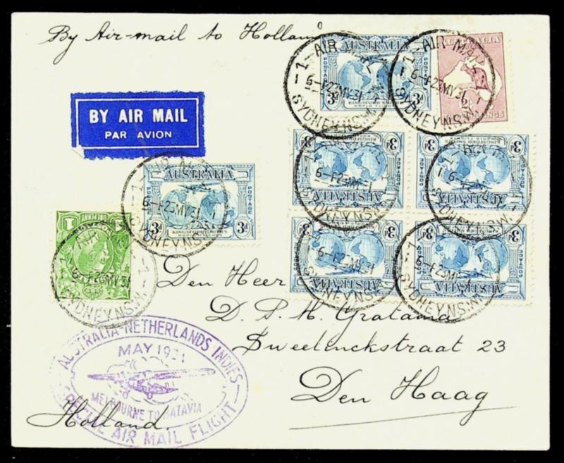Australia-Netherlands Indies 1931 special airmail flight cover w/ 3d block of 4+ 4v to Netherlands (Image)