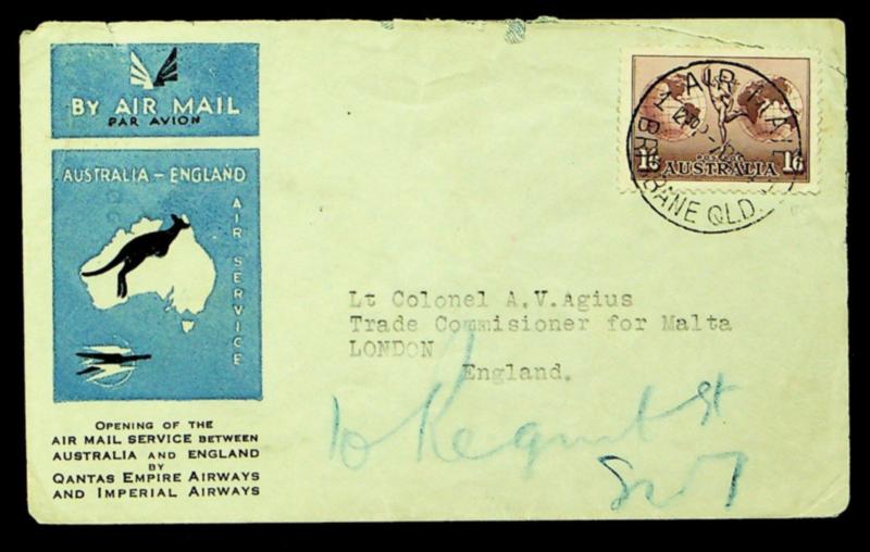 Australia 1/6 on QANTAS First Flight Airmail cover from Brisbane QLD. to London England (Image)