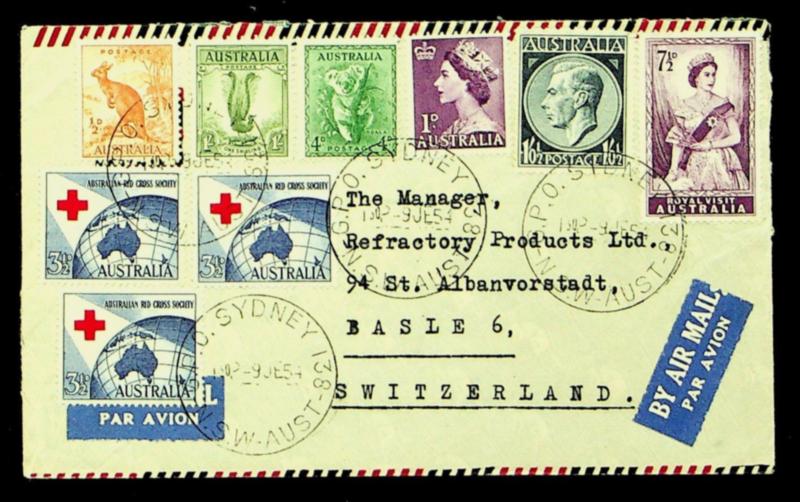 Australia 1954 Red Cross 3v+6v on airmail cover from Sydney NSW to Basel Switzerland (Image)