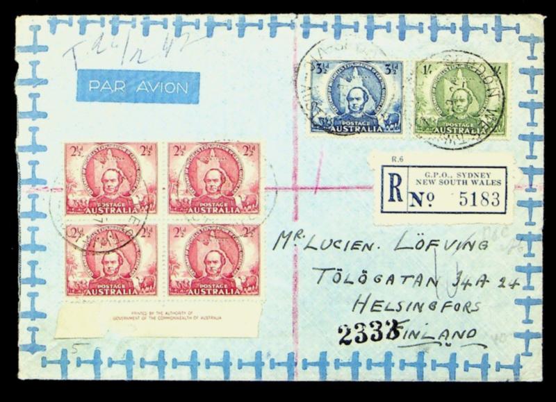 Australia Mitchell's Exploration 6v Regd Airmail cover from Sydney to Helsinki Finland (Image)