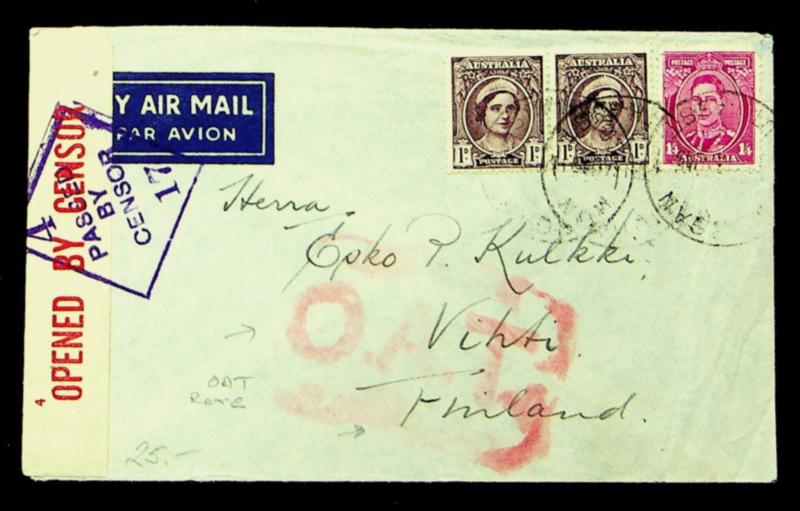 Australia Queen Mother KGVI 3v censor Airmail cover to Vihti Finland (Image)