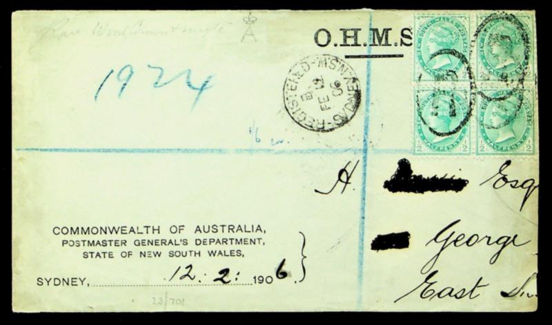 New South Wales Australia 1906 QV ½d block of 4 on OHMS Regd part cover from Sydney to Melbourne (Image)