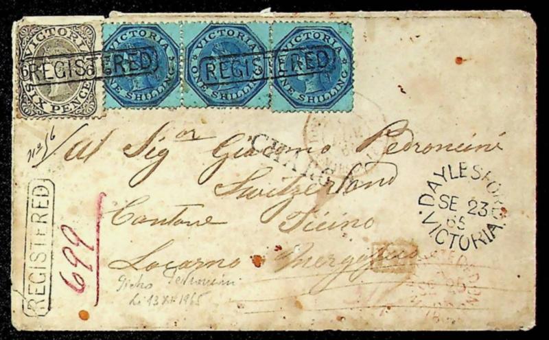 Australia Victoria 1865 4 QV on regd cover w/charge cachet from Daylesford to Locarno Switzerland (Image)