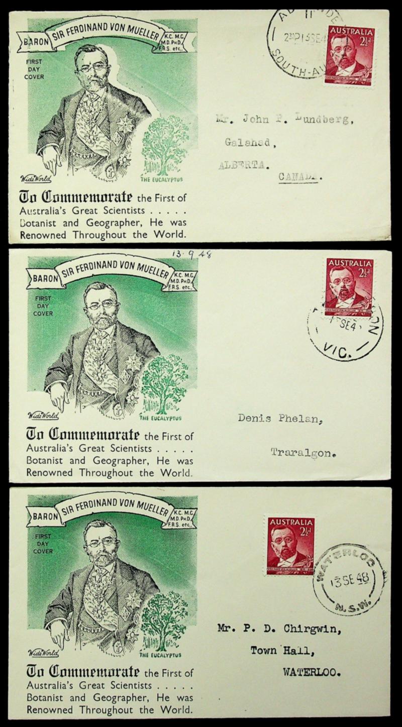 Australia 1948 Baron Sir Ferdinand Von Mueller 3 FDC w/ different cancels to various destinations (Image)