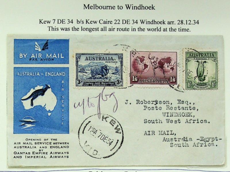 Australia 1934 3v on Qantas & Imperial Airways Airmail FFC from Kew, Melbourne via Cairo Egypt to Windhoek South Africa (Image)