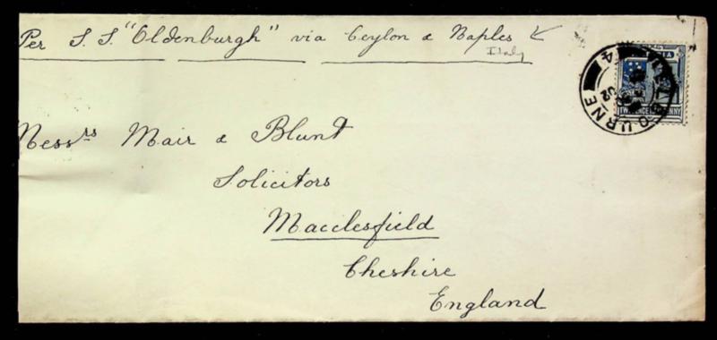 Australia 1902 2½d on cover from Melbourne, per SS "Oldenburgh" via Ceylon/ Naples Italy to Macclesfield England (Image)