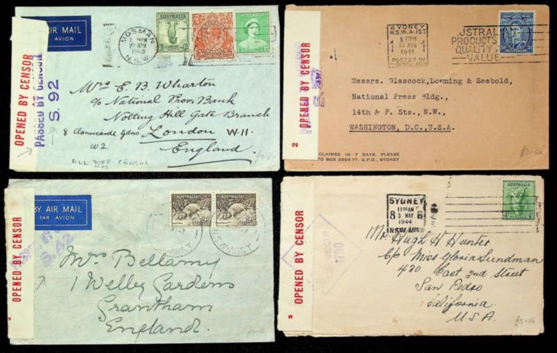 Australia 1940-44 WWII group of 4 different censored covers, 2 airmail to England/ USA (Image)