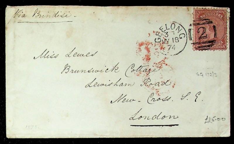 Victoria Australia 1874 QV cover cancelled w/ duplex "2" & "Geelong" cds via Brindisi Italy to London England (Image)