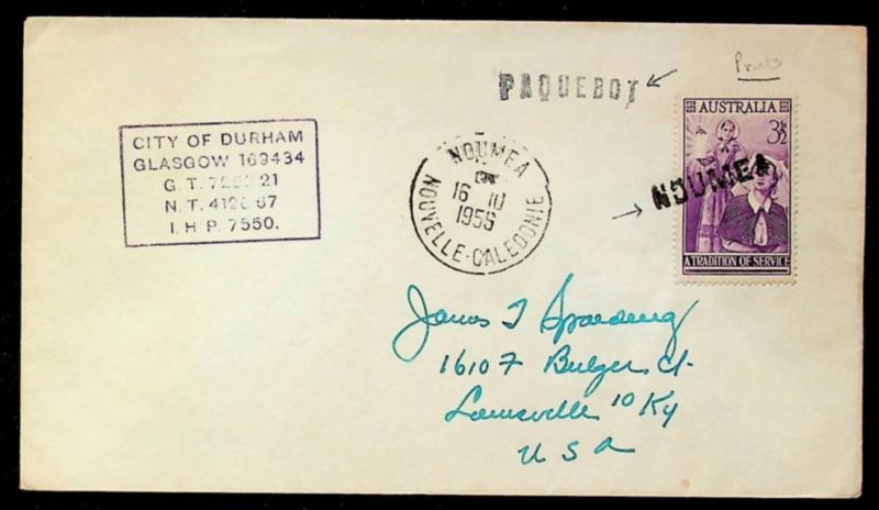 Australia 1956 Nursing 3½d on GB Glasgow Scotland, Paquebot, Noumea New Caledonia cover to USA (Image)