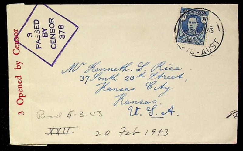 Australia 1943 WWII KGVI 3½d on Passed by Censor-378 cover to Kansas USA (Image)