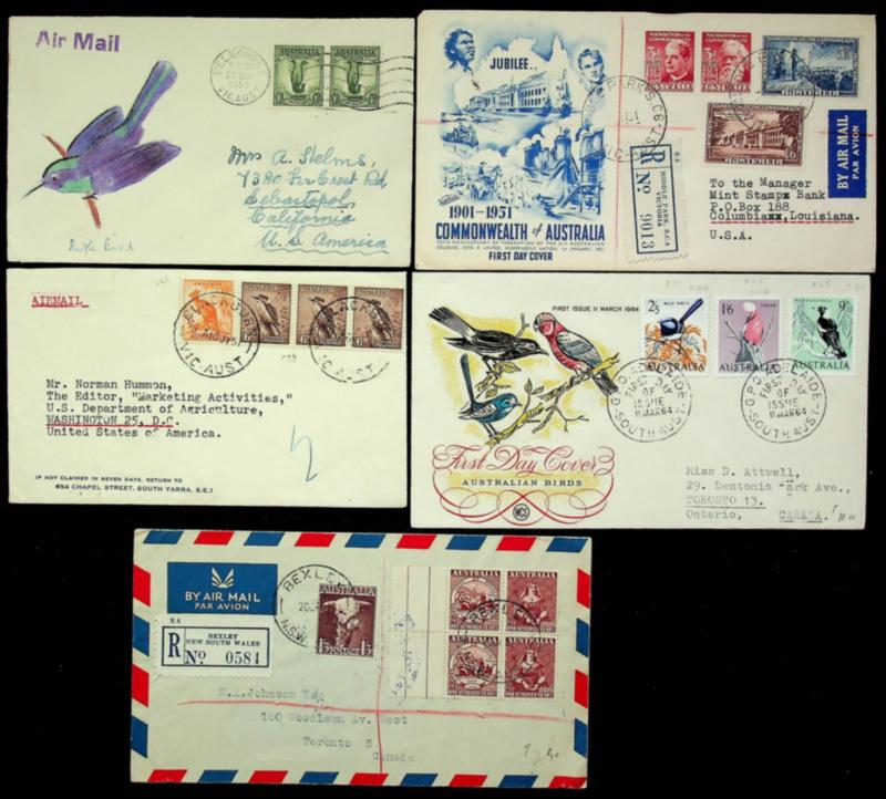 Australia 1951-64 group of 5 airmail covers/ Jubilee, Birds FDC, 2 Regd to USA/ Canada (Image)