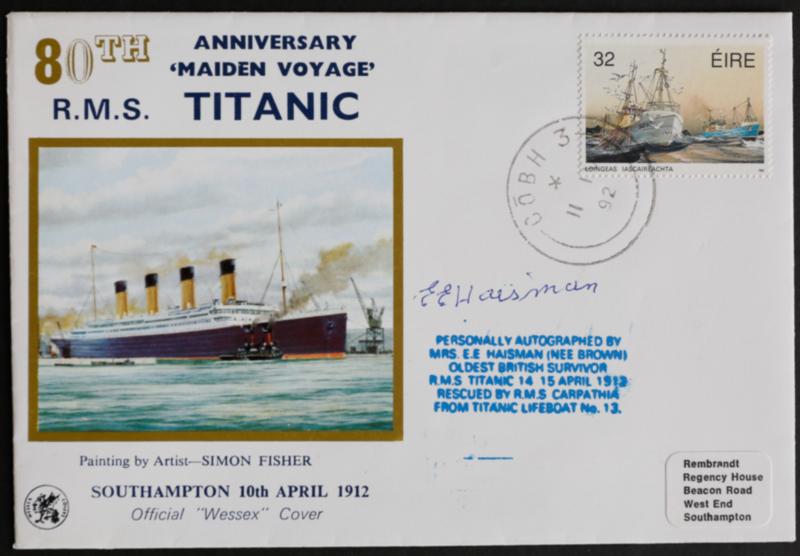 Autographs 1992 80th Anniv. of the Maiden Voyage R.M.S TITANTIC three different Official Wessex covers signed by Mrs E.E. Haisman (Nee Brown), the oldest British Survivor rescued by R.M.S Carpathia from lifeboat No. 13. Rarely seen as either individual covers or as a set, very scarce. (Ref: 00217/1) (Image)
