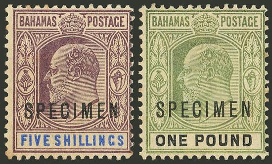 Sc.42 + 43, 1902 Edward VII 5S. and 1£, both with SPECIMEN overprint, the former with original gum, the other one without gum, VF! (Image)