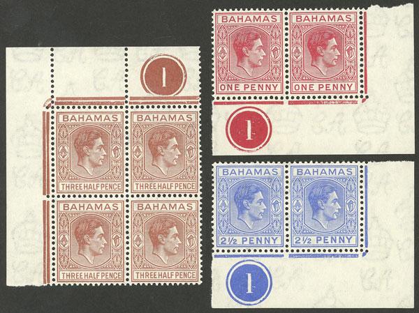 Sc.101 + 102 + 104, 1938/47 1p. and 2½p. in corner pairs and 1½p. in corner block of 4, all with number "1" in the margin, MNH (the block with light hinge mark in the top margin), excellent quality! (Image)