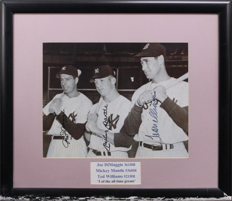JOE DIMAGGIO, MICKEY MANTLE & TED WILLIAMS: three signatures on b/w photograph, window mounted, framed & glazed, overall 78x68cm (some damage to base of frame). With CoA.