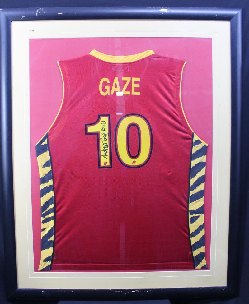 Signed basketball singlets Andrew Gaze signature on Melbourne Tigers singlet, window mounted, framed & glazed, overall 90x111cm; plus Chris Anstey signature on black singlet, framed & glazed, overall 62x92cm.