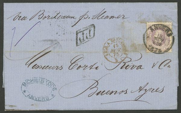 18/NO/1875 Anvers - Buenos Aires by French mail, entire letter franked by Sc.36 ALONE with datestamp of ANVERS (apparently on the left originally another stamp was affixed that was probably not necessary, and it was removed BEFORE being cancelled), red "BELG. A ERQUELINES 19/NOV" double circle, "PP", "FRANCE - MIDI 2" (same day), "LIGNE J - PAQ. FR. Nº4 - 20/NOV", and arrival mark 18/DE, very fine quality, rare! (Image)