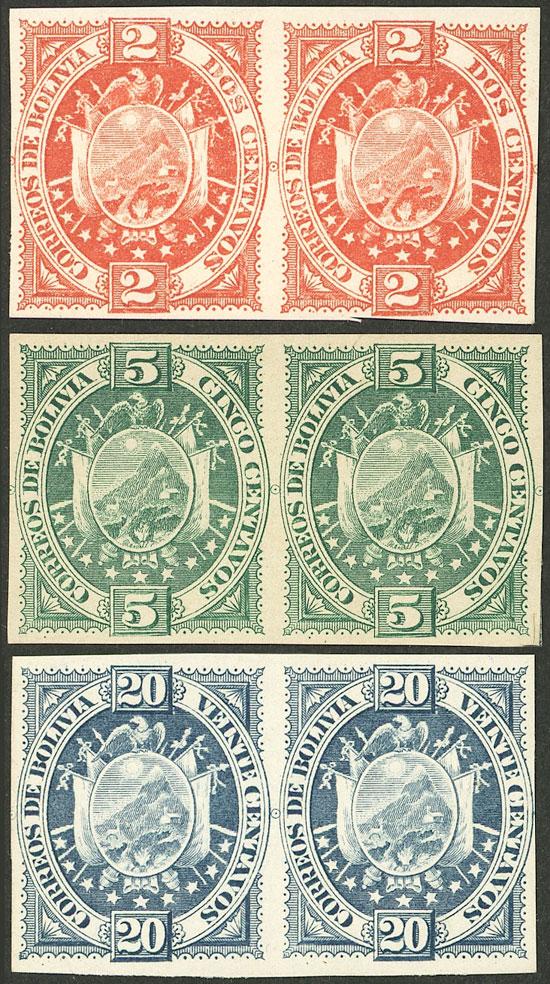 Yvert 40 + 41 + 43, 1894 Coat of arms 2c., 5c. and 20c., 3 IMPERFORATE PAIRS, very fine quality! (Image)
