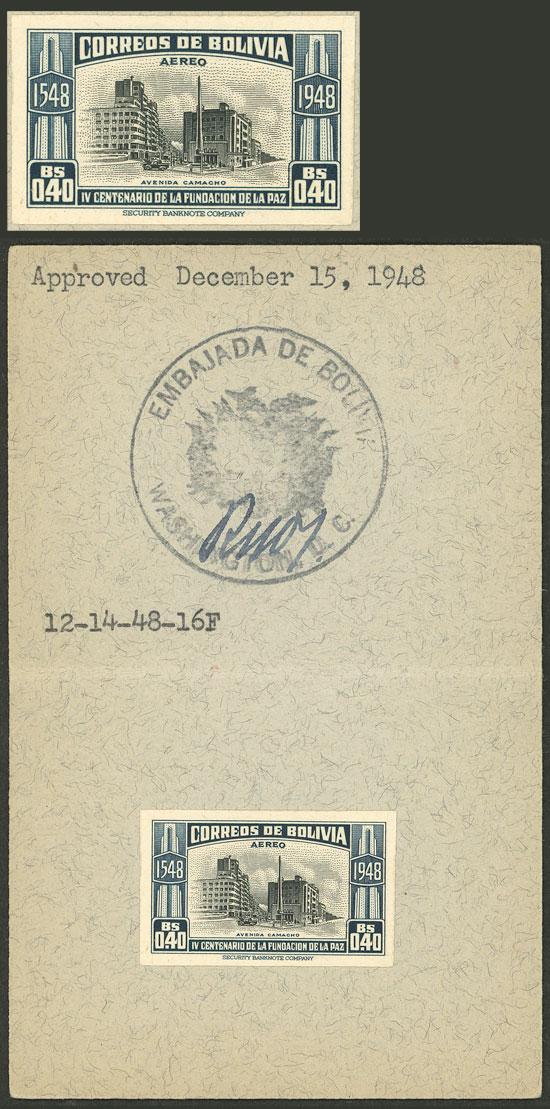 Yvert 119, 1951 40c. Camacho avenue (La Paz), PROOF mounted on card, presented by the printer to the postal authorities for approval before printing, rare, very fine quality! (Image)