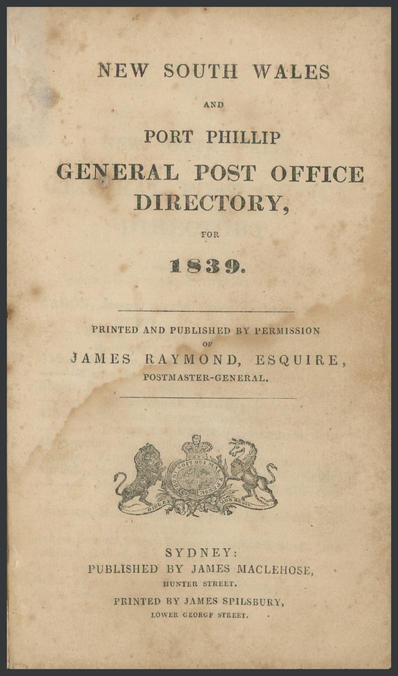AUSTRALIA - NEW SOUTH WALES: 'New South Wales & Port Phillip General Post Office Directory for 1839, Printed & Published by Permission of James Raymond Esq Postmaster-General' published by James Maclehouse & printed by James Spilsbury, 180pp 8vo in non-contemporary leather binding with gilt title, repaired tear at upper-left of the title page which has a water-stain, light foxing throughout but fully legible. An extremely rare little tome that provides an alphabetical listing of all the white adult male residents of the colony from 'AARON, Joseph, general dealer, Castlereagh-street, Sydney' through to 'ZOUCH, Lieutenant JP, Raby, Liverpool'. Much fascinating content including of the earliest settlers in the Port Phillip District, original placenames, idiosyncratic spellings, etc. A valuable resource for the postal historian or genealogist. (Image1)