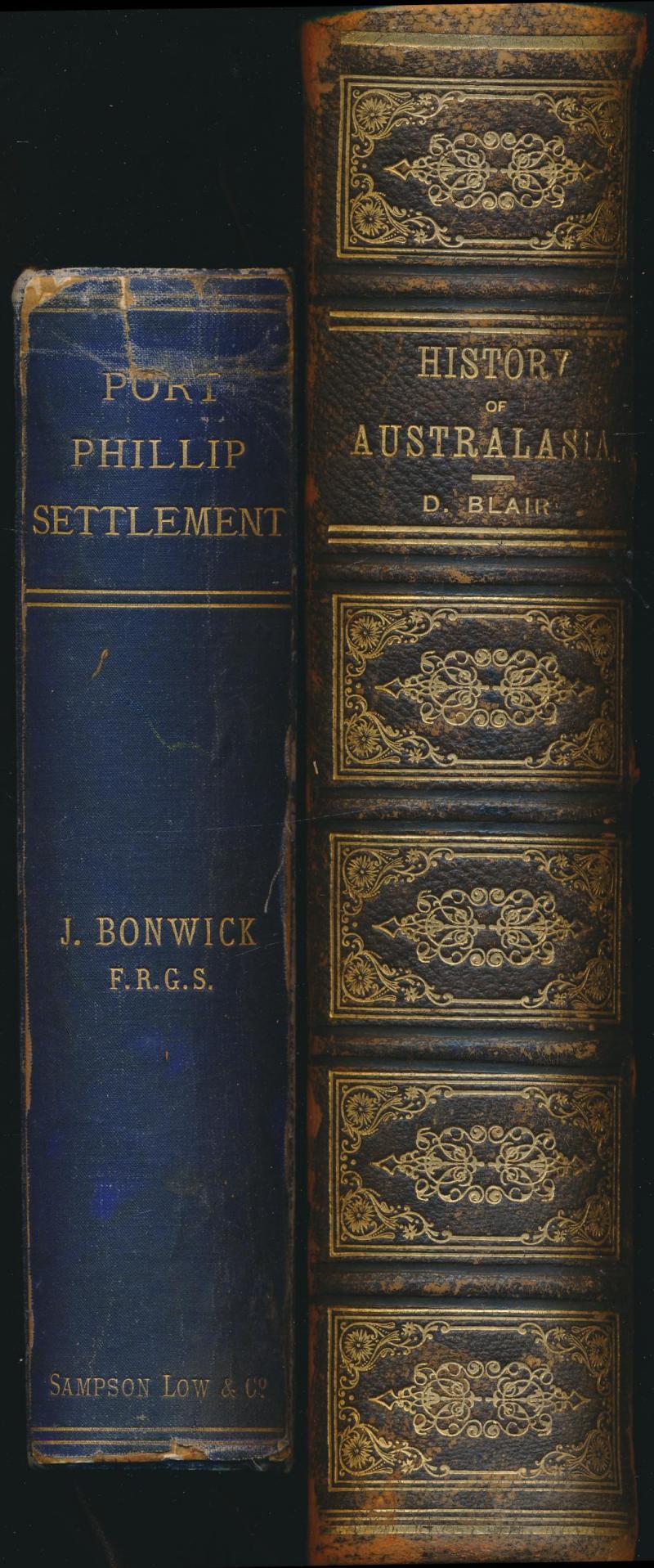 AUSTRALIA & MELBOURNE: 'The History of Australasia' From the first dawn of discovery in the Southern Ocean to the establishment of self-government in the various colonies - with some account of Fiji and New Guinea by David Blair (1879) gilt-inlaid h/b cover, 771pp with illustrations; and 'Port Phillip Settlement' (1883) by James Bonwick h/b 538pp illustrated with fold-out facsimile letters; both with some foxing otherwise fine.