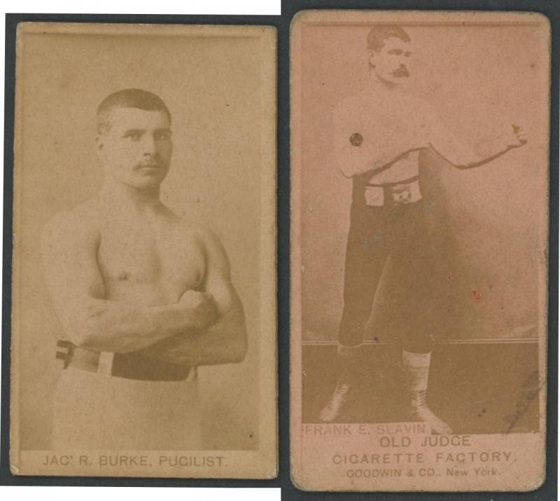 1887-89 Goodwin & Co (Old Judge Cigarettes) 'Celebrities' inscribed 'Jac R Burke, Pugilist' & 'Frank E Slavin', Fair/Fine condition. Burke is Style A, with Old Judge advertisement on reverse; Slaven is Style B with Old Judge advert on front & blank reverse. [This set includes 11 cards showing Australian Rules footballers that are extremely rare - two are in the football cards section: see Lots 719818 & 719819].