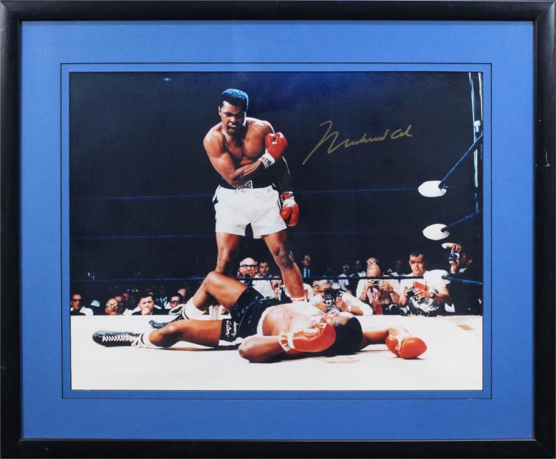 MUHAMMAD ALI: signature on colour photograph of a triumphant Ali standing over a vanquished Sonny Liston, window mounted, framed & glazed, overall 66x56cm. (Image1)