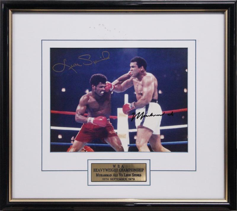MUHAMMAD ALI v LEON SPINKS both signatures on photograph of 1978 WBA Heavyweight Championship, window mounted, framed & glazed, overall 42x39cm. (Image1)