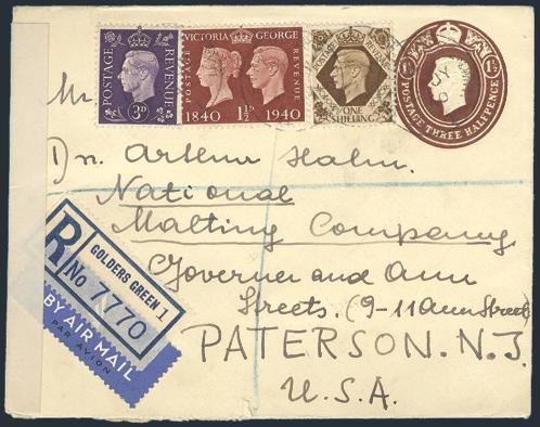 GR. BRITAIN WWII CENSORED COVERS TO CANADA & USA: Interesting coll of WWII Censored covers to Canada & USA. Has a variety of cancels, censor tape types & Examiner #'s. Most neatly written up in detail on cards. Several have enclosures. We noted Green Cross cover, a few black out cancels, variable rates, etc. Mostly VG-F (59) (Image)
