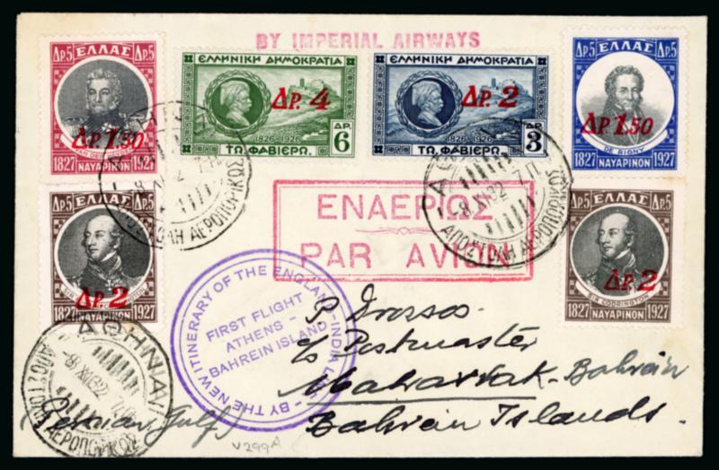 1932 (8 Nov) Greece to Bahrain, Imperial Airways first flight cover, franked with Greek stamps of the 1927-28 issue overprinted 1.5 d in red; six stamps on front and a single on reverse, all tied by Athens cds, Struck by purple “By the new itinerary of the England-India line”, Bahrain receiver 10 Nov on back. (Image)
