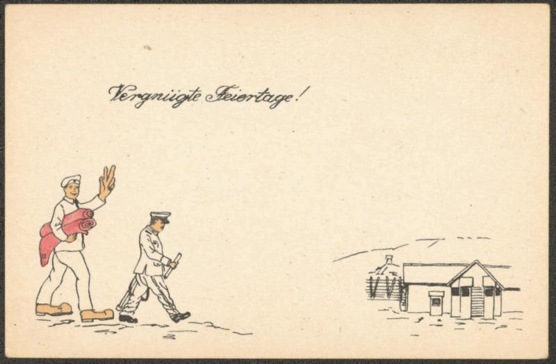 BANDO, Lagerpostkarte "GEISHA" mit Vignette Type II in braun, Motiv "GEFANGENER WIRD IN DEN ARREST GEFÜHRT" Serie Vergnügte Feiertage, tadellos ungebr. Ex Nachlass Erich Maye. Laut Seitz ist dieses Motiv bisher nicht nachgewiesen. (Image)