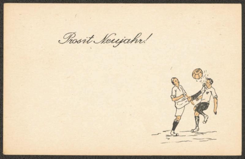 BANDO, Lagerpostkarte "FUJIYAMA" mit Vignette Type I in braun, Motiv "GEFANGENE SPIELEN FUSSBALL" Serie Prosit Neujahr, tadellos ungebr. Ex Nachlass Erich Maye. Laut Seitz ist dieses Motiv bisher nicht nachgewiesen. (Image)