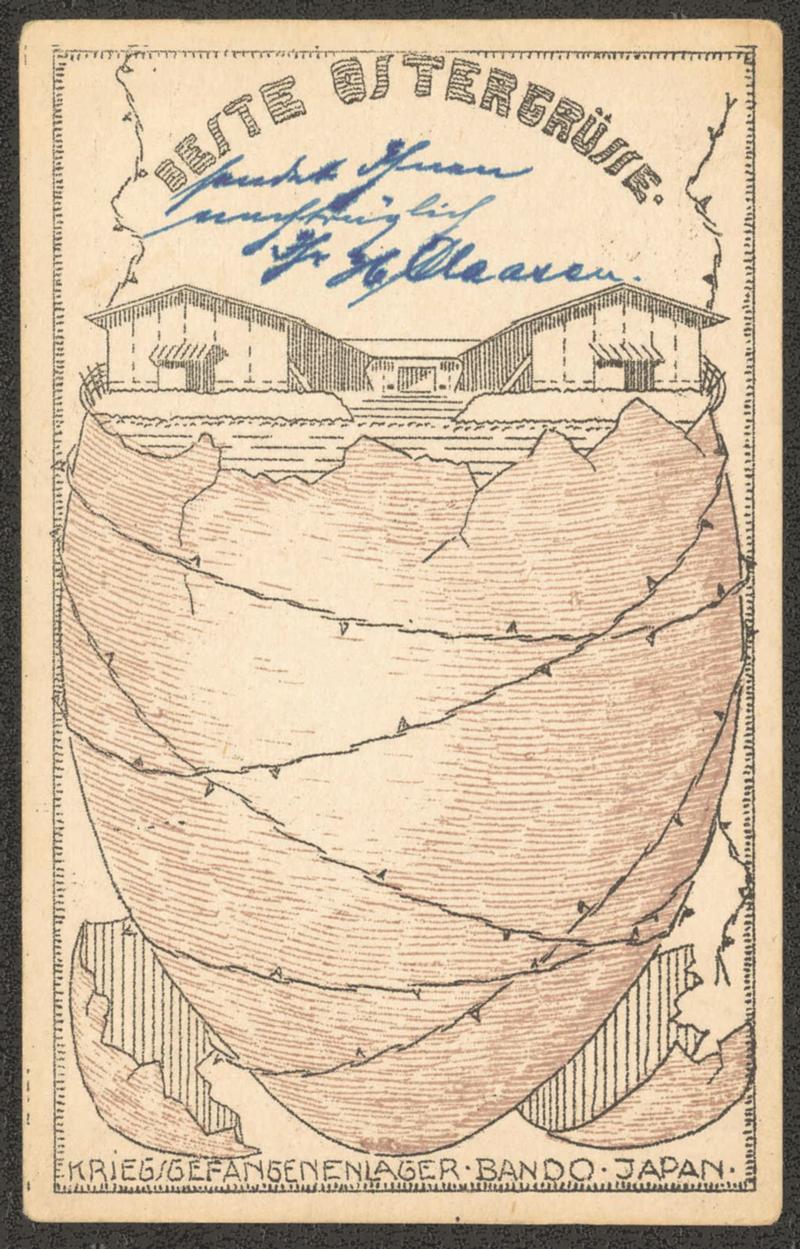 BANDO, Bildpostkarte Motiv "GROSSES EI MIT STACHELDRAHT" Baracken farblos anstatt gelb (Seitz 35bI), von Unteroffizier Claasen, aus dem Lager Bando mit Han eines Zensors, an den Matrosen Erich Maye im Lazarett Tokushima, vom "23.4.19". Selten! Ex Nachlass Erich Maye. (Image)
