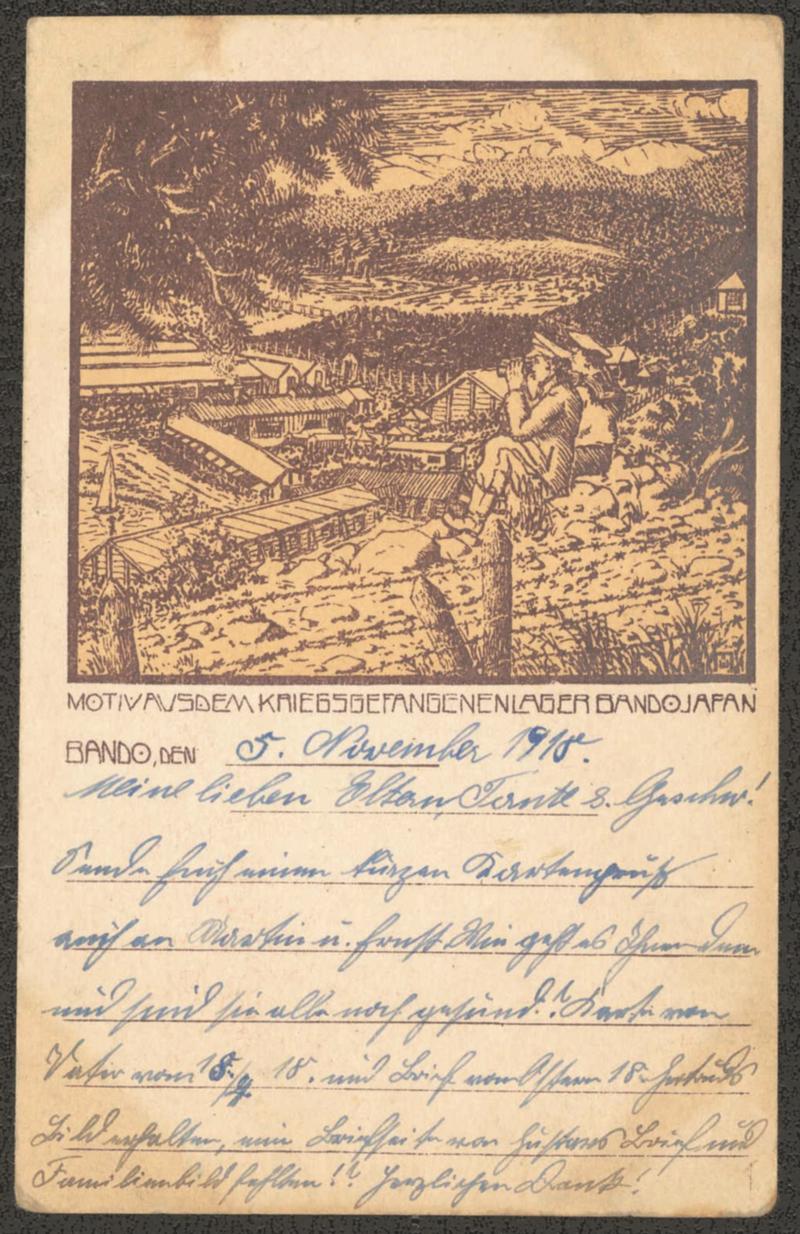 BANDO, picture postcard topic "view on the camp" Seitz 44, with camp cancel, post endorsement cancel Doitsu-yuki, Censor Ao Shin, from "19.11.18" to Schleiz. Ex estate Erich Maye.