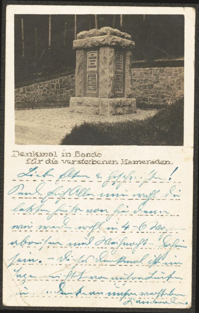 BANDO, Bildpostkarte Motiv "DENKMAL BANDO" Seitz 49, mit Lagerstempel Typ I, Postleitstempel Doitsu-yuki und Auslandspoststempel "KOBE", vom "20.9.19" nach Schleiz. Interessanter Text über die bevorstehende Heimfahrt. Ex Nachlass Erich Maye. (Image)