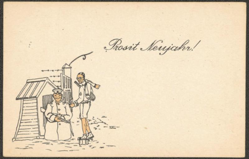 BANDO, Lagerpostkarte "GEISHA" mit Vignette Type II in braun, Motiv "SPORTLER ZEIGT AUSWEIS" Serie Prosit Neujahr, tadellos ungebr. Ex Nachlass Erich Maye. Seitz 69b. (Image)