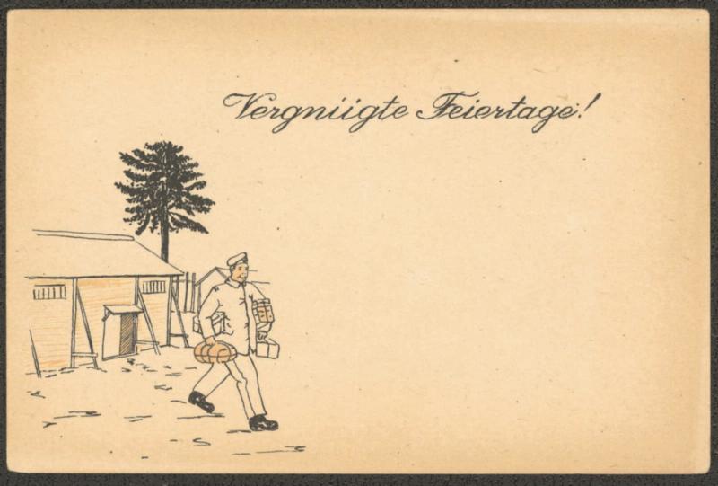BANDO, Lagerpostkarte "GEISHA" mit Vignette Type II in rot, Motiv "GEFANGENER MIT PAKETEN" Serie Vergnügte Feiertage, tadellos ungebr. Ex Nachlass Erich Maye. Seitz 68b. (Image)
