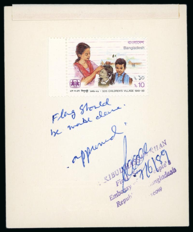 Bangladesh 1989 perforated proof affixed to embossed framed card with Children's Village 10t with manuscript note about flag, "approved" below this, handstamp of Bangladesh Embassy and on reverse handstamp of Moscow printers (Image)