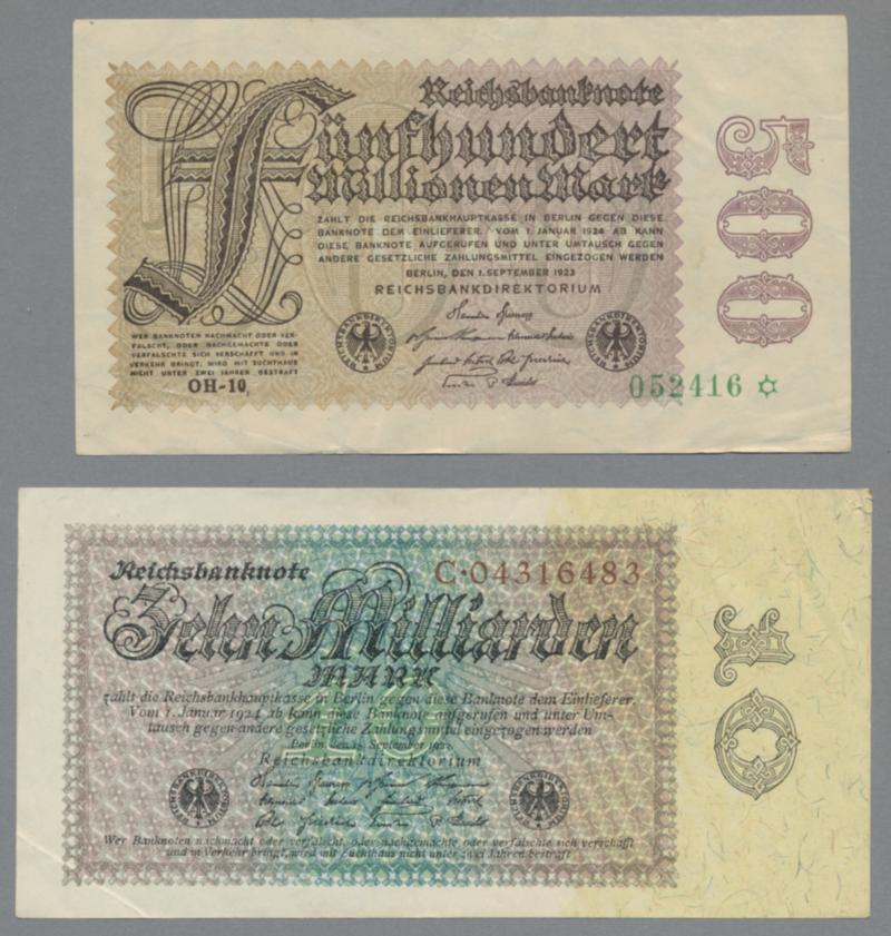 Deutschland - Deutsches Reich bis 1945 1908-1942, Partie von etwa 290 Banknoten mit u.a. Kaiserreich, Inflation und Weimarer Republik. Zusätzlich sind noch ca. 220 deutsche Notgeldscheine (meist Serienscheine), ein paar DDR-Orden, 6 verschiedenen Notmünzen von Sachsen aus Porzellan von 1921 und 43 Banknoten aus aller Welt aus den Jahren 1909 bis 1988 enthalten. Die Erhaltung bei den Banknoten ist jeweils von kassenfrisch bis stärker gebraucht. (Image)