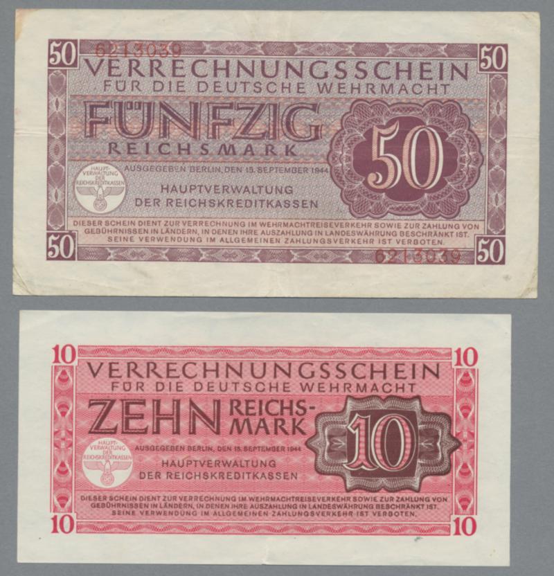 Deutschland - Nebengebiete Deutsches Reich Wehrmacht, 1939-1944, kleine Partie mit 5 Verrechnungsscheinen für die Wehrmacht zu 1, 5 (2 Stück), 10 und 50 Reichsmark (Rosenberg Nr. 511, 512, 513 und 514), einem Behelfszahlungsmittel für die Wehrmacht zu 1 Reichsmark (Rosenberg 505) und 2 Reichskreditkassenscheinen zu je 1 Reichsmark (Rosenberg Nr. 551 a). Die Erhaltung ist von kassenfrisch bis gebraucht. (Image)