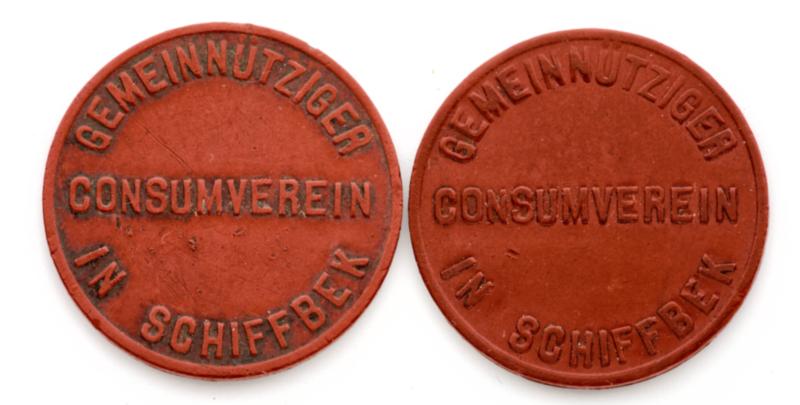 Deutschland - Notgeld besonderer Art SCHIFFBEK, 2 Notmünzen zu je 50 Pfennig des "Gemeinnützigen Consumverein in Schiffbek" (heute Hamburg), jeweils in sehr schöner Erhaltung und je ohne Jahresangabe. Erhaltung: sehr schön (Image)