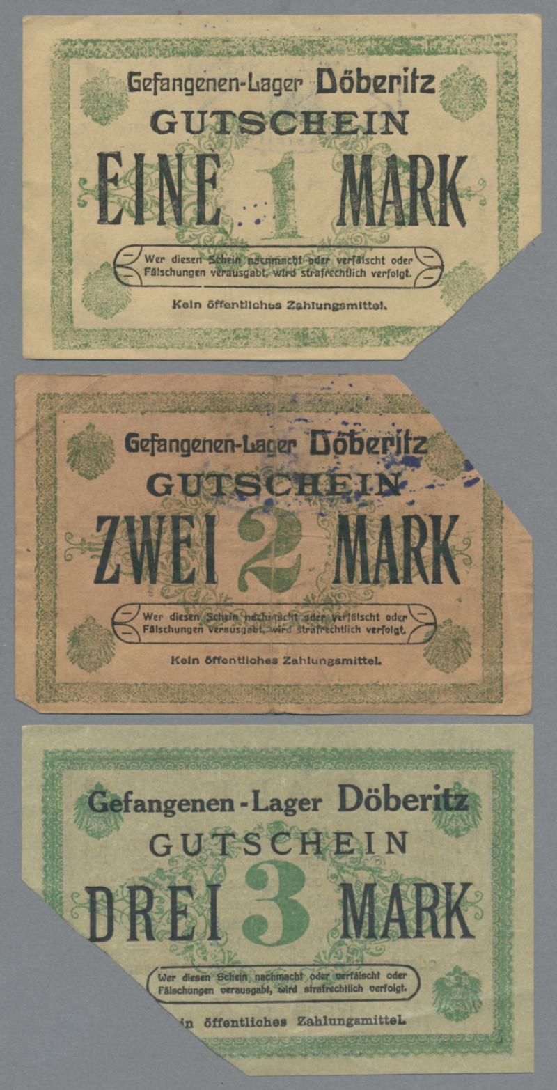 Deutschland - Notgeld 1914-1923 (ca.), kleine Partie mit 3 verschiedenen Notgeldscheinen aus dem Gefangenenlager Döberitz (je mit einer abgeschnittenen Ecke zur Entwertung), 1 Franc der französischen Besetzung der Rheinlande und einem 100 Millionen Mark-Notgeldschein von Zoppot vom 28. September 1923. Alle Scheine sind in gebrauchter Erhaltung. (Image)
