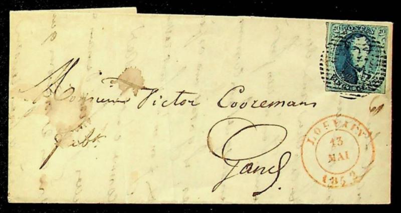 Belgium 1852 20c Imperf on cover from Louvain to Gand (Image)