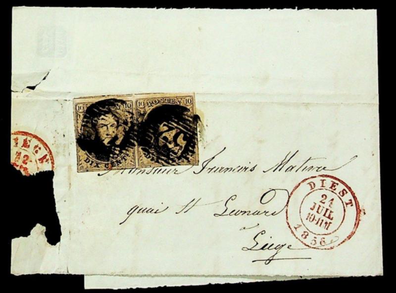Belgium 1856 Leopold I 10c Imperf pair on cover from Diest to Liege (Image)