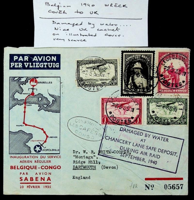 Belgium Congo 1940 WWII Wreck Sabena Airmail FFC from Leopoldville to England w/ "DAMAGED BY WATER" cachet (Image)