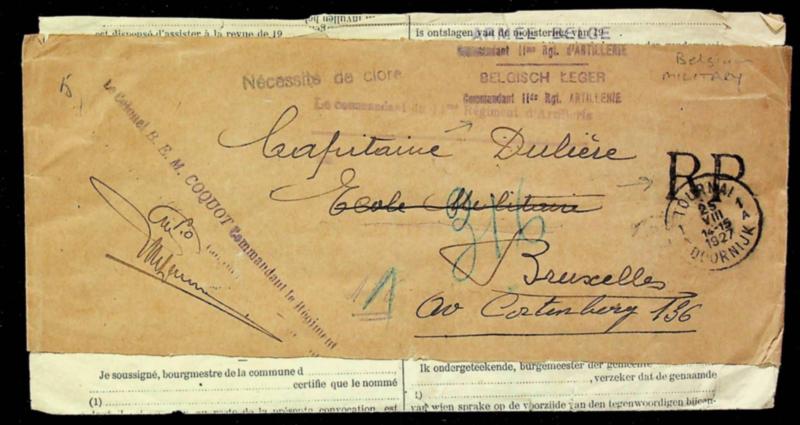 Belgium 1927 Soldier's Free Mail Military printed matter w/ "RP" cachet from Tournai to Brussels (Image)