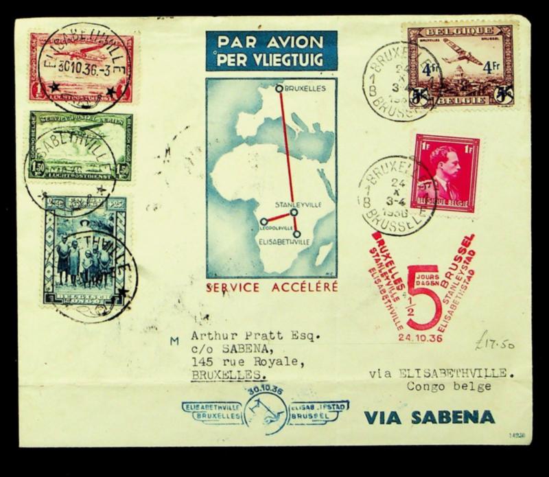 Belgium Congo 1936 5v combined franking on Sabena Airmail FFC from Brussels to Elisabethville & return (Image)
